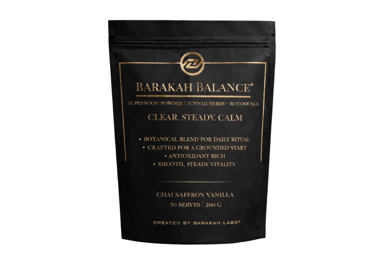 Barakah Balance™ is a concentrated botanical and nutritional blend designed for individuals committed to composure, clarity, and self-mastery — without harsh stimulants or crashes.